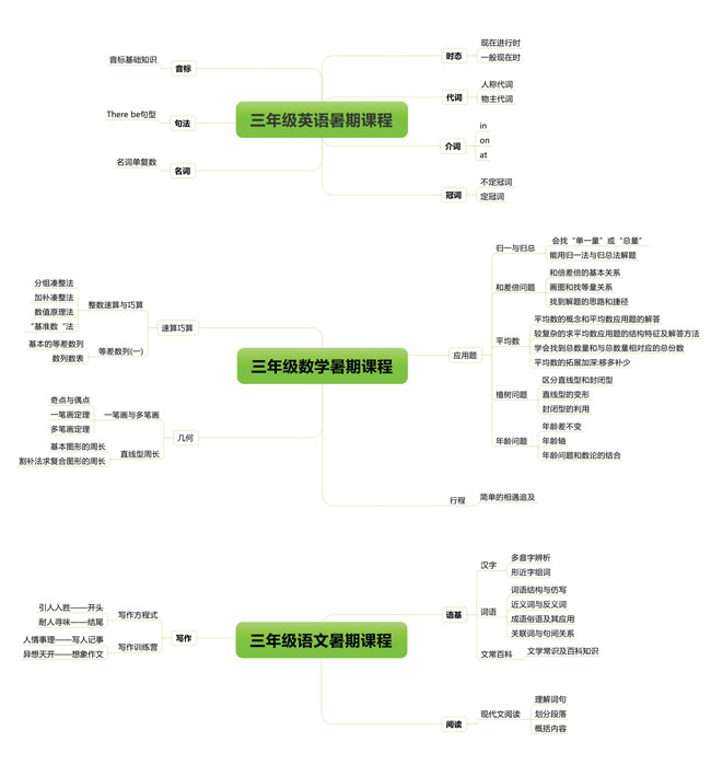 三年级是培养学生学习兴趣,督促学生养成良好学习习惯的关键时期。暑期的学习内容并不求多,而是对知识点和思维方式的理解和感悟。数学学习的重点是计算问题和几何问题;英语则侧重基础语法和语言的学习;语文需要学生重点把握基础字词知识,适当地让学生练习写作即可。